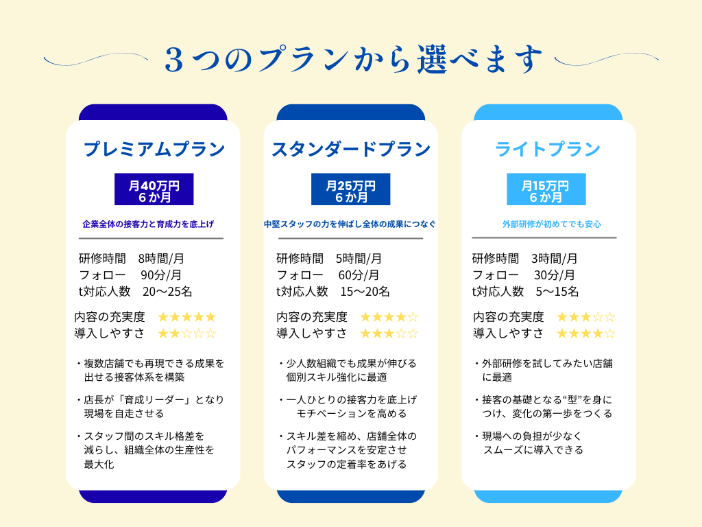 年齢や経験に関係なく、「もっと良くしたい」「変わりたい」という気持ちさえあれば研修の効果はしっかり現れます。実際、長年の接客で固まっていた癖が改善され、提案力が大きく伸びた例も多くあります。